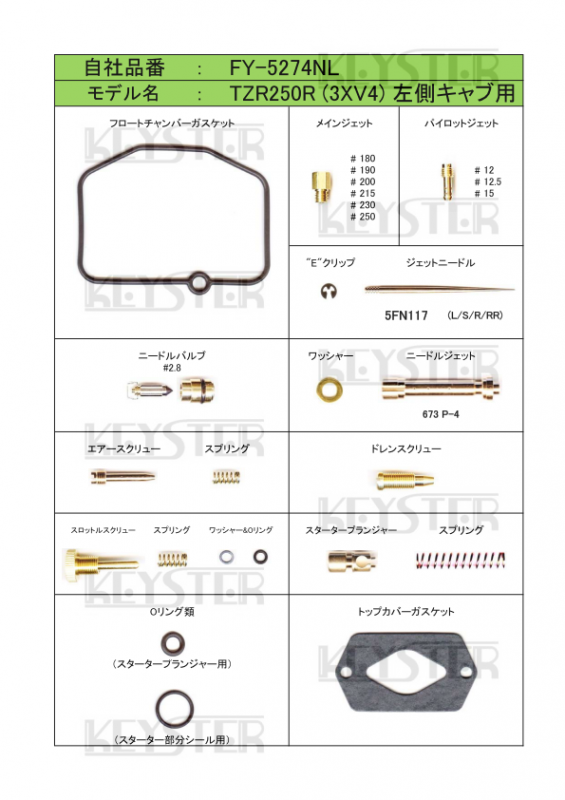 燃調キット TZR250R (3XV4), 左側キャブレター用キャブレター オーバーホール&セッティングパーツセット, スロットルバルブガイドガスケット付き